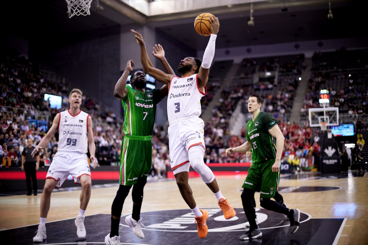 Rousselle, que gairebé el donaven per descartat per jugar aquest partit, encetava el segon període amb dos triple que ràpidament feia demanar temps mort a Zan Tabak (minut 11, 26-19). Sir’ Jabari Rice apareixia al rescat amb 5 punts consecutius per donar resposta al bon moment local, però el MoraBanc era incapaç d’igualar la duresa dels andalusos (minut 15, 33-24). Tot i ser severament castigats amb les terceres faltes de Pustovyi i Rice, la reacció dels nostres acabaria arribant de la mà d’un Aaron Best que ha estat excepcional avui (27 punts). Tot i la línia ascendent dels nostres, era Bozic el que acabaria anotant una cistella i addicional per tancar la primera meitat amb el 41-35. La millor noticia en veure com de dur es posava el partit era, sens dubte, que només eren 6 punts de diferència.